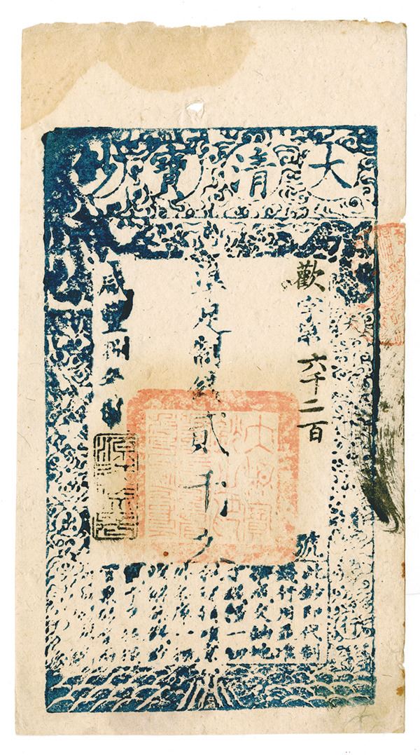 China, (Year 8), 1858, 2000 Cash, P-A4f (S/M#T6-51), Issued banknote, The usual Spindle hole on top margin, S/N 6200, Appears AU with a water stain on the upper left excess margin, attractive for issue.