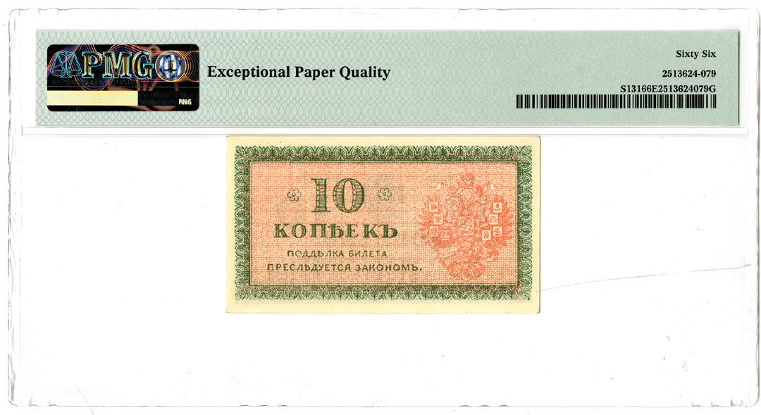 Russia/North Russia, ND (1919). 10 Kopeks, P-S131, Issued Banknote. Green on peach underprint. PMG graded Gem Uncirculated 66 EPQ. Tied for highest graded out of 13 graded in the PMG census. Rare and attractive note in high graded. This is the first uncirculated note to be offered at auction.