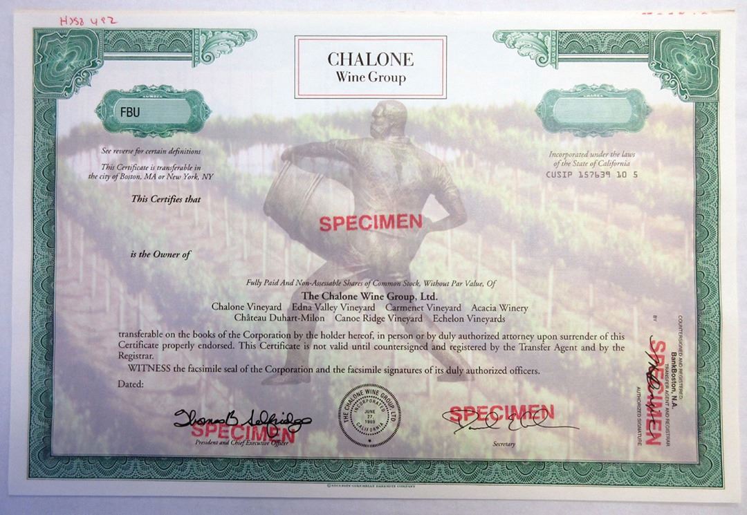 CA. Chalone Wine Group, Ltd., 1970s Odd Shrs Specimen Stock Cert., VF-XF SCBN. Colorful and full cover undertint of man holding wine barrel with vineyards in background.