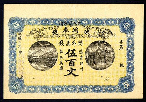 Value 500 Mon; Private cash certificate issuing company Chan Hong Tai, Republic 3rd year, black vignettes, blue border and light yellow undertint, back orange, XF to Choice XF condition. Scarce and attractive private issue.