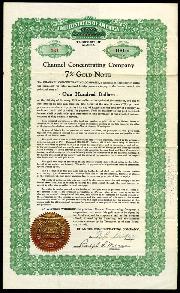 Channel Concentrating Co. 1926 7% Gold Bond. Alaska (Territory), 1926, $100. 7% gold note. Issued and uncancelled. Green border with no vignette, gold foil embossed seal. Far west Litho, Seattle, VF. Rare Alaska mining related bond.