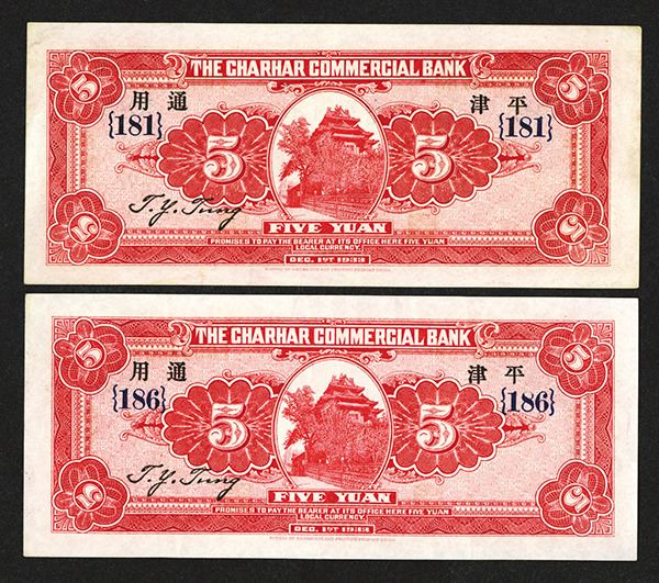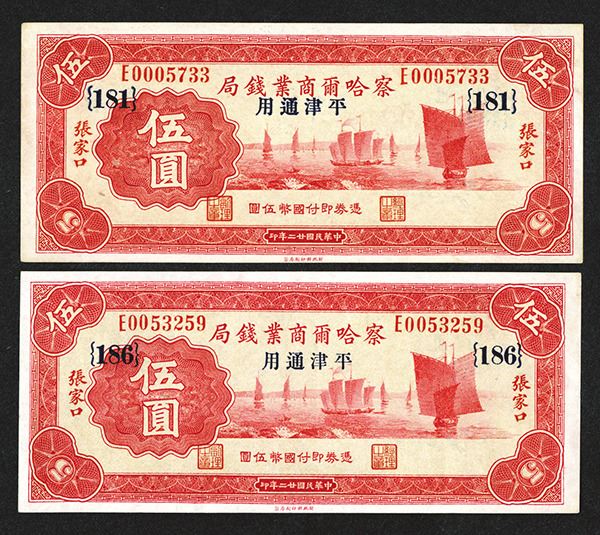 China, Republic. 5 Yuan. P-S356Ca. Sailing ships on the river. Kalgan vertically at left and right ends. Choice Uncirculated. 2 pieces.