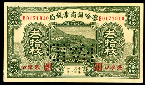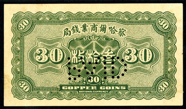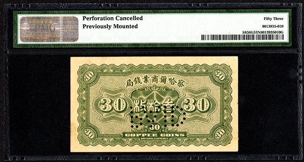 China, 30 Coppers, P-S856G S/M#C3-6, Issued banknote, Green with hillside building, back green, Pin-punch "PAID" across central vignette and unlisted in this form, PMG graded About Uncirculated 53 NET with note of perforation cancelled and previously lightly mounted, S/N B0171910, Extremely rare note and the first time this variety has been offered by us. This is the only one graded in the PMG census.