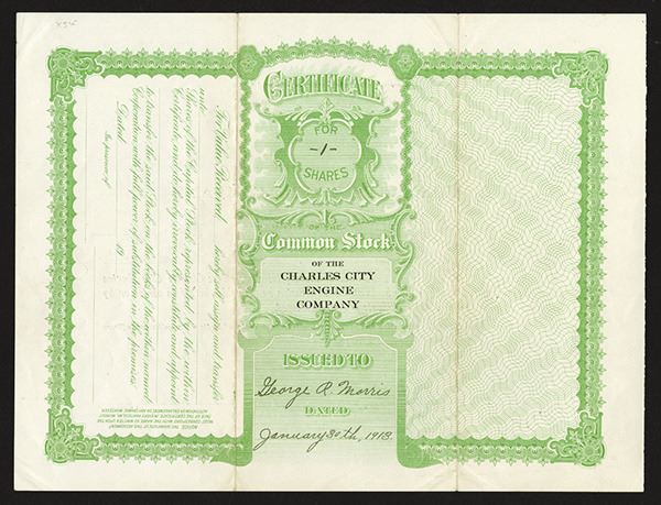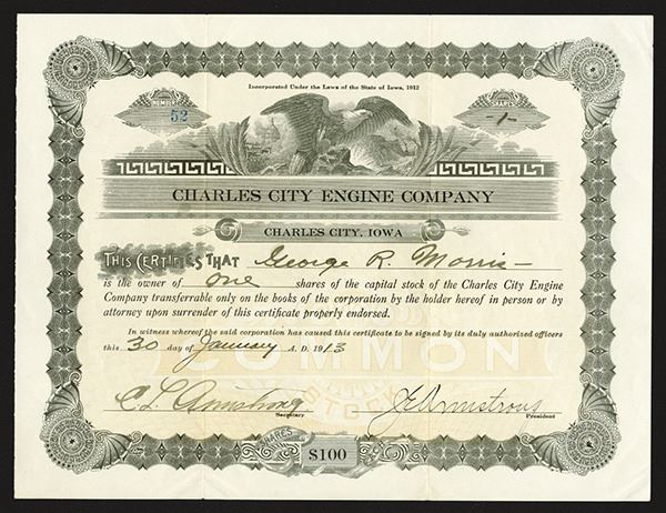 Charles City, Iowa. 1 Shares, I/U, Black on light yellow, Patriotic screaming eagle at top on Goes type of certificate form, S/N 52, VF to XF condition. Possibly railroad or Fire Department related certificate. Found in an old estate sale. Rare Iowa stock certificate.