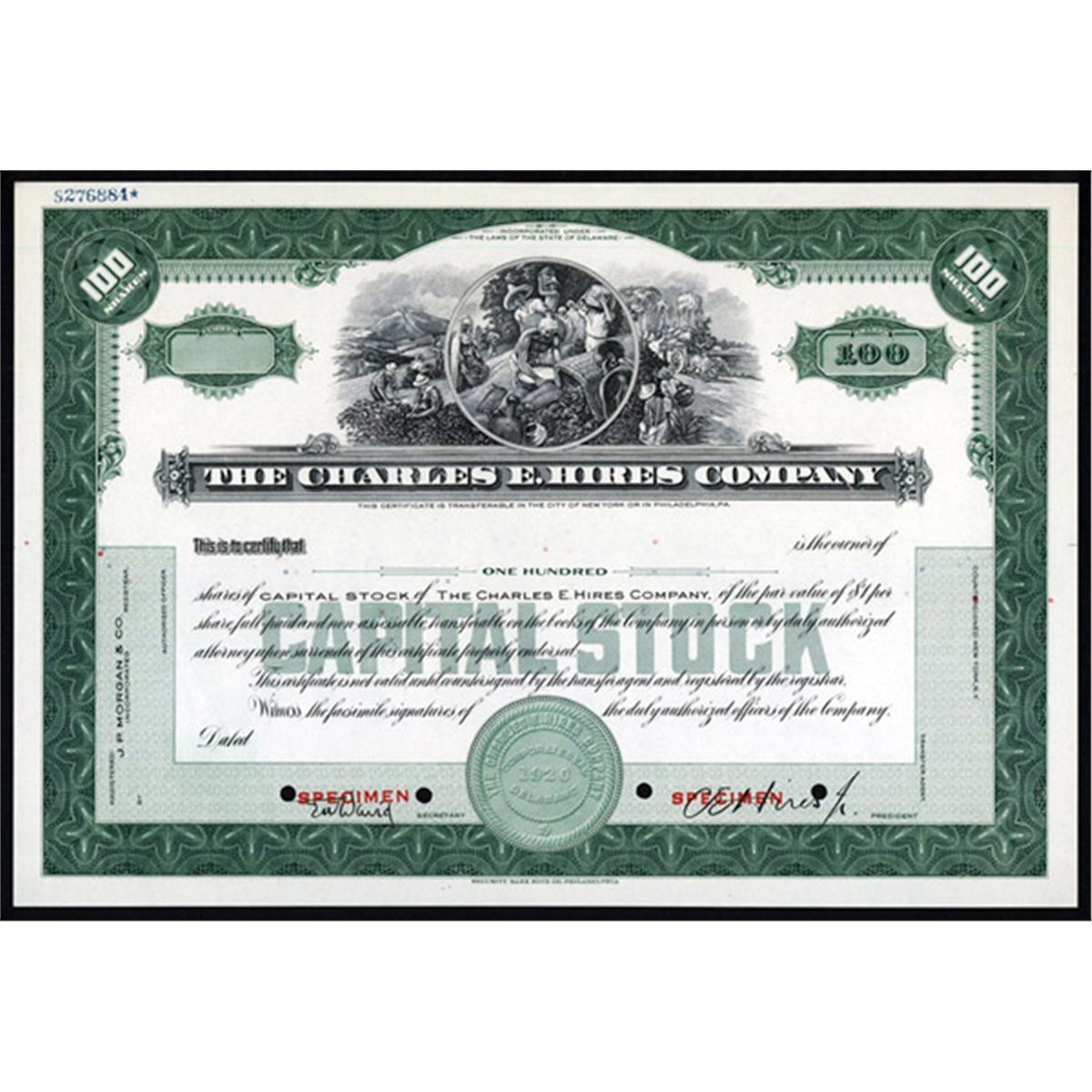 Pennsylvania, 100 Shares, Specimen Stock, Black on green border and underprint, Three different farming scenes in differing locales top center, VF-XF condition, SBNC. Rare and popular stock certificate from this well known soft drink company.