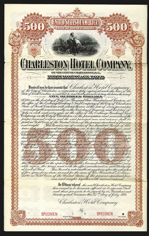 Charleston, SC, $500 Specimen 7% Specimen Coupon Bond. Black on light brown. ABNC.