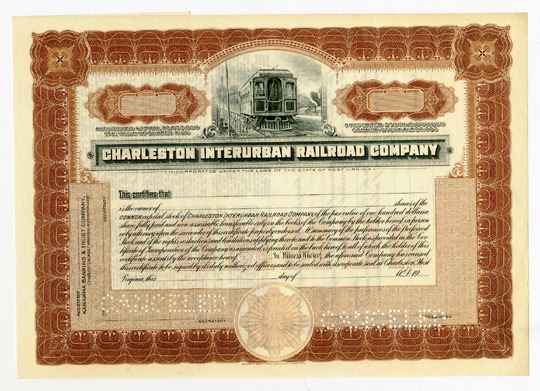 WV. 1910-20, Charleston Interurban Railroad Co., Black text and vignette, brown border and underprint, inter-urban street car over title in top, Odd Shrs Specimen Stock Cert. SBN. Charleston Interurban Railroad operated two interurban lines. In 1935, the rails were bought by the Charleston Transit Company which converted the whole system to buses in 1939.