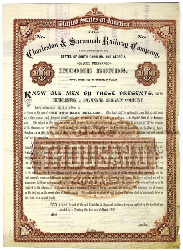 Georgia and South Carolina. 1886, Specimen 2nd Preferred, 7% Registered Bond, Black printing on brown border and underprint, back with "Return to Issue room - To be Held for Reference", POC's, Extremely rare bond with this being one of 2 examples found for this railroad in the ABN Archives. Franklin BNC.