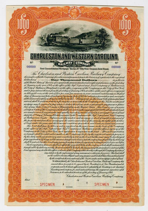 South Carolina. $1,000, bond, camelback loco and long coal train r-l, vertical format, 1st consolidated mortgage, bearer gold coupon, 50-yr, 1914, due 1964, by ABN, series B, 5%.