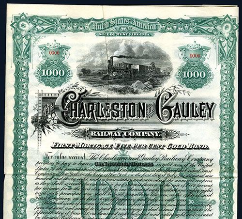 West Virginia, 18xx, $1000, First Mortgage 5% Gold Bond, Specimen Bond, Black on green border and underprint, Moving locomotive top center, VF condition, ABNC.