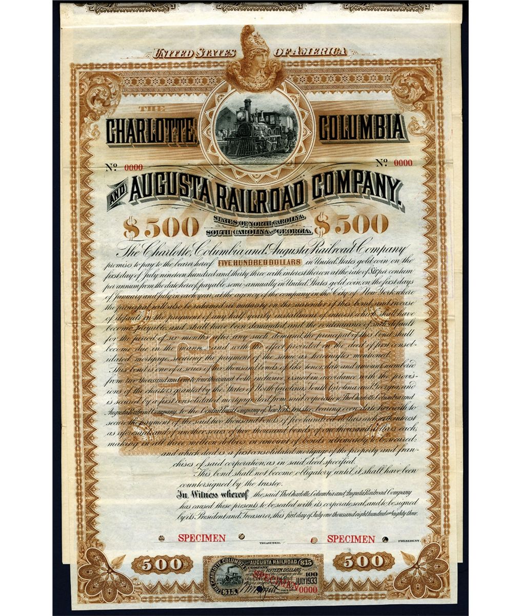 North Carolina. South Carolina. Georgia, $500 1st Consolidated Mortgage 6% bond. Brown border. Locomotive at station with Liberty with helmet over it. VF condition. POC's. Rare and attractive bond. Listed as proof only, not as specimen.