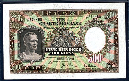 Hong Kong, 1977, $500, P-72d, Issued banknote, black and dark brown on m/c underprint with male portrait on left, back brown, Signature titles “Accountant” and “Chief Manager in Hong Kong”, S/N Z/P 874468, PMG graded Choice Very Fine 35 EPQ, Bright colors, large even margins and sharp corners only add to the desirability of this rare not. TDLR.