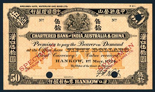 Hankow, China, 1 May 1924, $50, P-S161 (S/M #Y11-32a), Uniface front specimen, no back, Unlisted Specimen Color Trial Banknote by Waterlow & Sons, face in dark blue on orange underprint, Supported Royal Arms at center, , two dark red Waterlow Specimen imprints at left and right, with their inscription and reference number 461 in upper margin. An exceptionally rare trial of a note that is very rare in issued form. W&S.