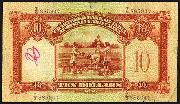 Hong Kong, 18th February, 1941, $10, P-55c, Issued banknote, Black and red on green, Helmeted warriors head on left, arms at center, back red, S/N T/G 885947, 2 printed signatures, Very Fine condition with graffiti on back, W&S.