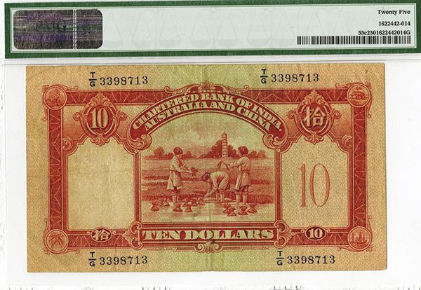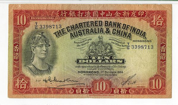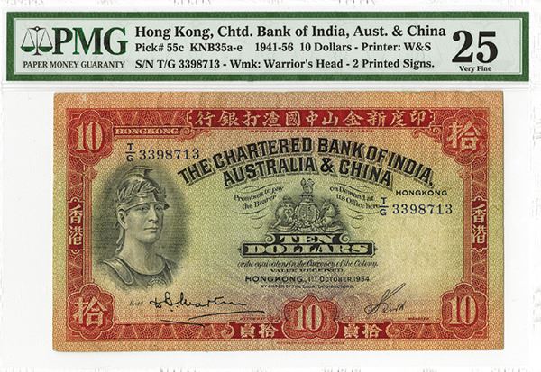 Hong Kong, 1954, $10, P-55c, KNB35a-e, Issued banknote, black and red on light green underprint with helmeted warrior on left, back red on m/c, S/N T/G 3398713, PMG graded Very Fine 25, very attractive with bright colors, sharp corners and fresh appearance with some light handling. W&S.