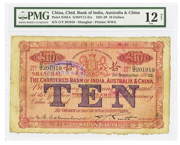 Shanghai, China. $5, P-S185A S/M#Y11-31c, Issued, red and violet, S/N G/T 201919, Blue oval hand stamp on left, PMG graded Fine 12 NET. Scarce note.