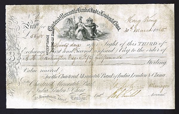 Hong Kong, 3rd of Exchange Draft, 55 Pounds Sterling, Black on gray wavy paper, Seated Britannia with lion and crown in middle. VF. Scarce early Hong Kong fiscal item.