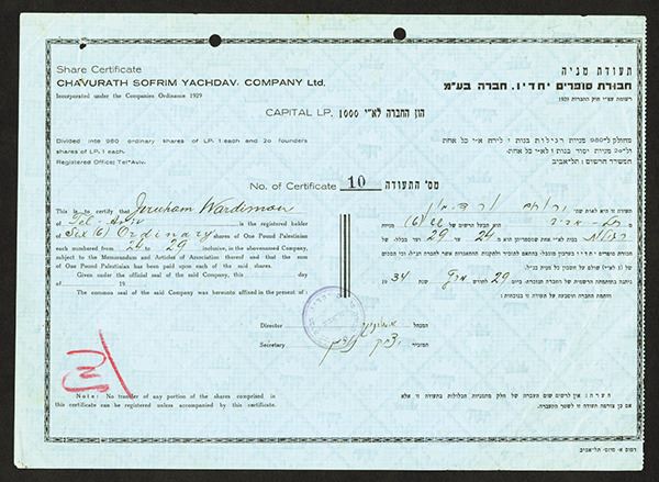 Palestine. Certificate for 6 ordinary shares. Low number certificate, number 10. I/C, red cancel mark in lower left corner. Fine