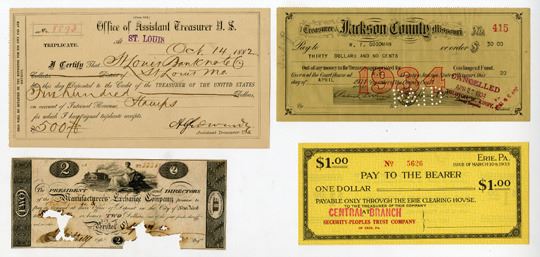 New York, Pennsylvania, Louisiana, Missouri, 1820-1934. Lot of 4 Items, Includes: ca.1840s(?)Manufacturers Exchange Co., $2 Obsolete banknote, VF with ink burn and paper loss at bottom signature areas; 1882, St. Louis. Office of Assistant Treasurer U.S., Receipt for $500 Deposit for revenue stamps, VF-XF condition; 1933, Erie Clearing House $1 Depression Era Bearer Scrip Note, AU-Unc. condition; and, Treasurer of Jackson County Missouri I/C Check for $30 with facsimile signature of Harry Truman, XF condition. (4). Sold "AS IS" no returns accepted.
