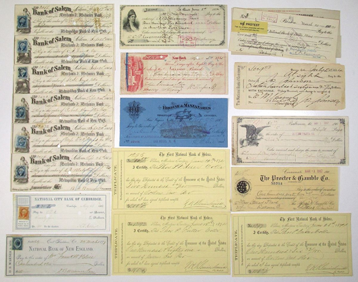 Various States, 1864 to 1907. Lot of 15+ Issued Checks, Highlights Includes: Bank of Salem, Procter & Gamble Co., National Bank of New England, Nassau Bank, and Browne & Nazanares. Checks range from Fine to XF condition. (18). Sold "AS IS" no returns accepted.