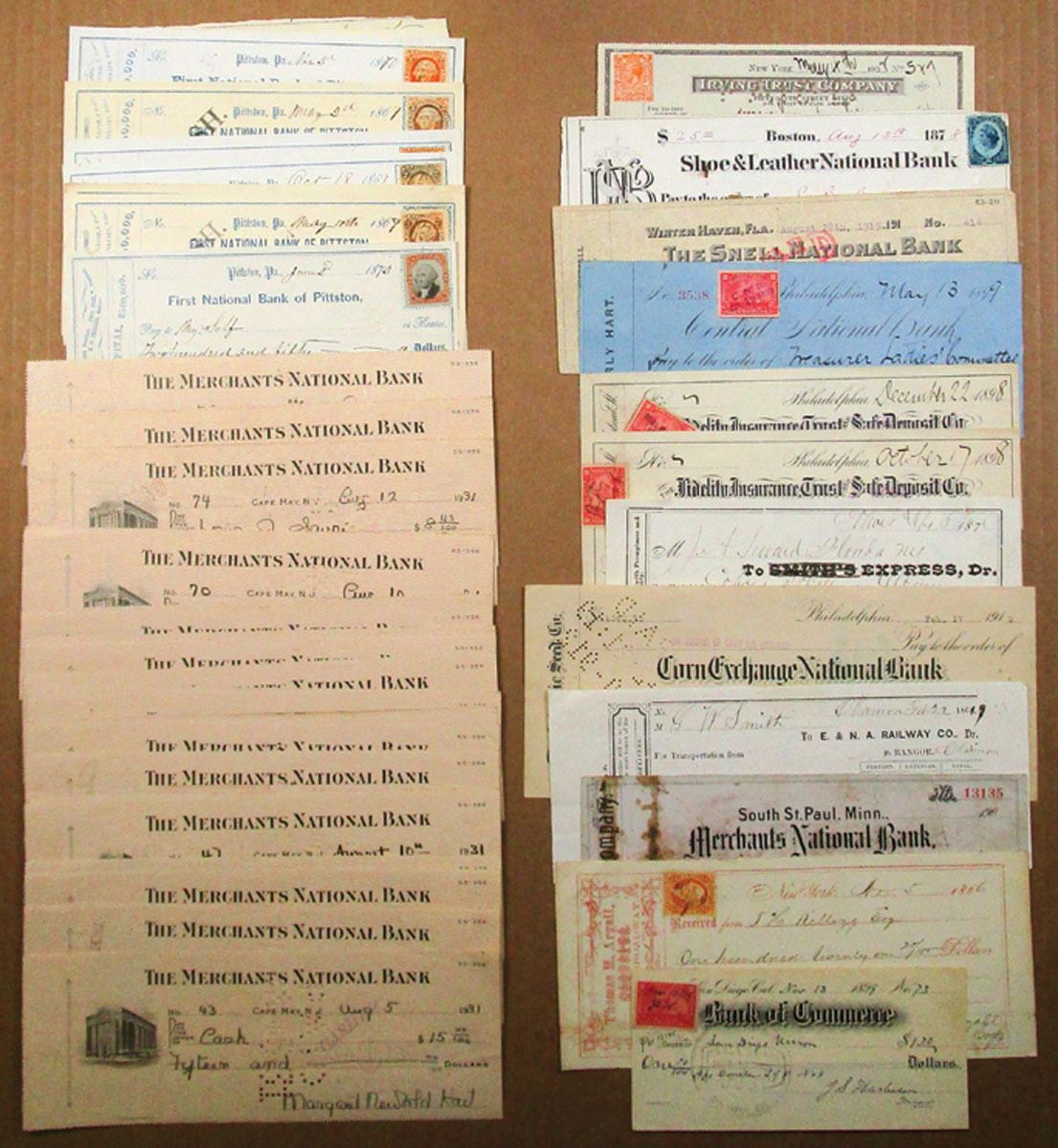 USA, 1863-1931. Lot of 60 Issued Checks, Highlights Includes: Fidelity Insurance, Trust and Safe Deposit Co., Central National Bank, Snell National Bank, Shoe and Leather National Bank, Merchants National Bank, Bank of Northern Liberties, and many more. Most checks have revenue stamps and range from VF to XF condition.
