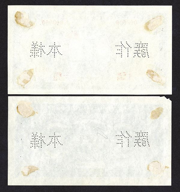 China, 1932, 5 Yuan, P-S875s, S/M# C26-11, Uniface Front and Back Specimen banknotes. Blue on m/c and back olive green, Pin-punch Specimen overprints. AU with mounting remnants on back and a small corner tip missing from the top left back corner away from printing. Unlisted as specimen banknote. CEPA. Rare note issued and unknown as a specimen.