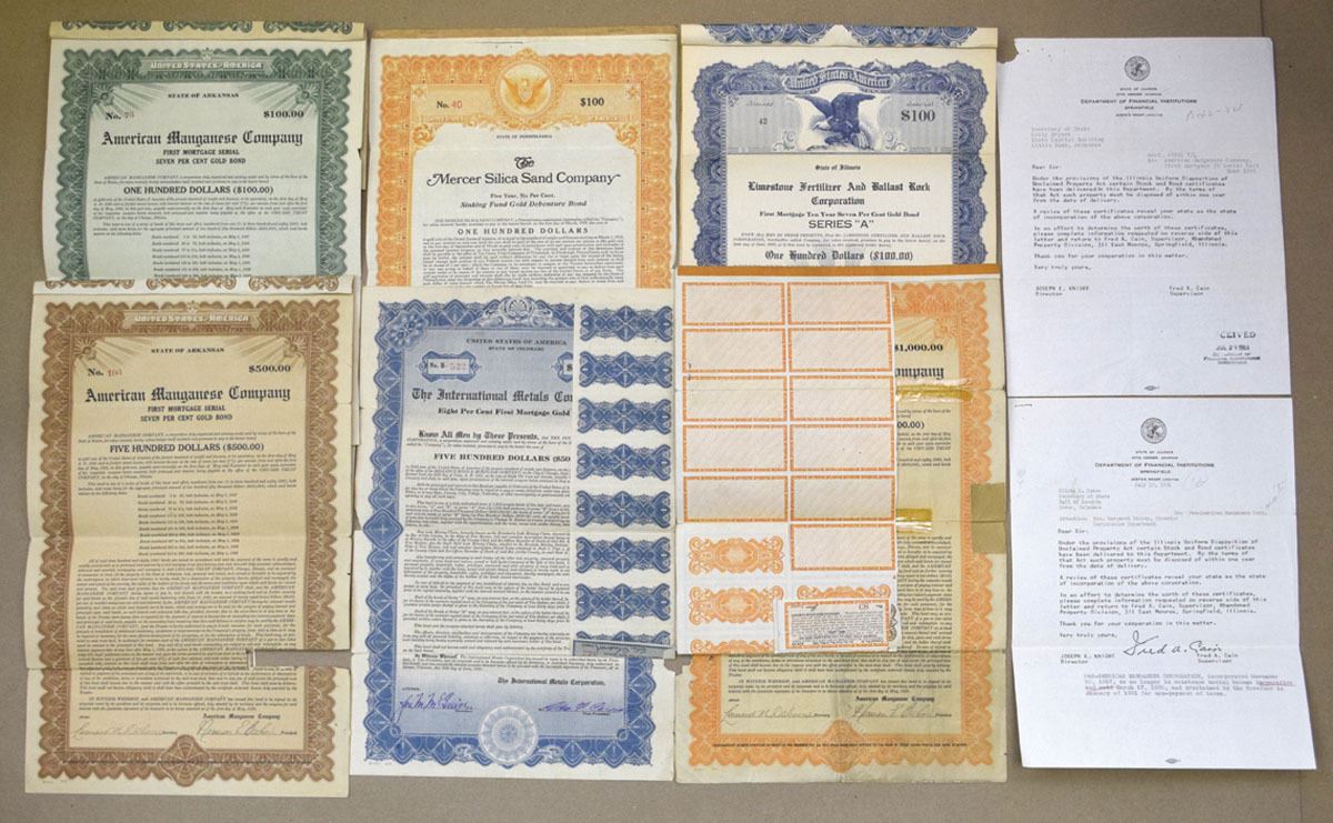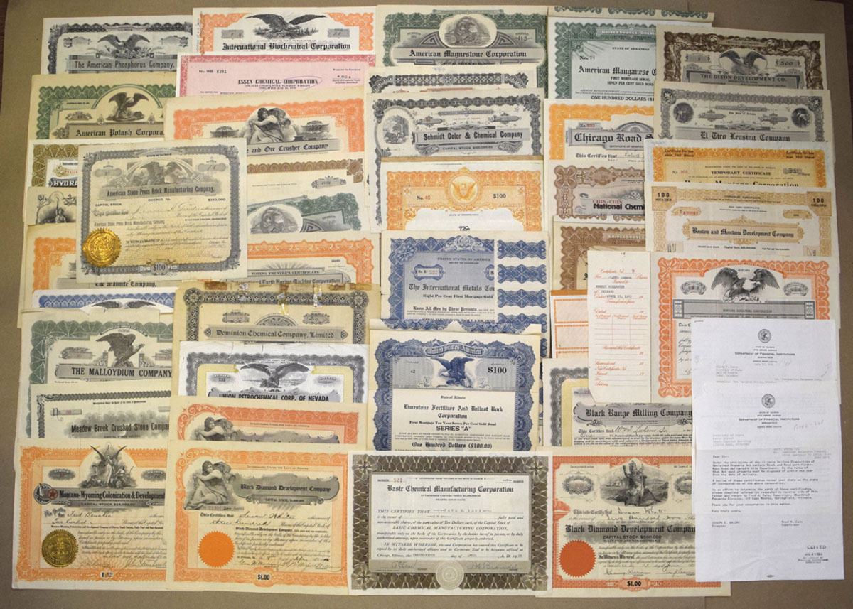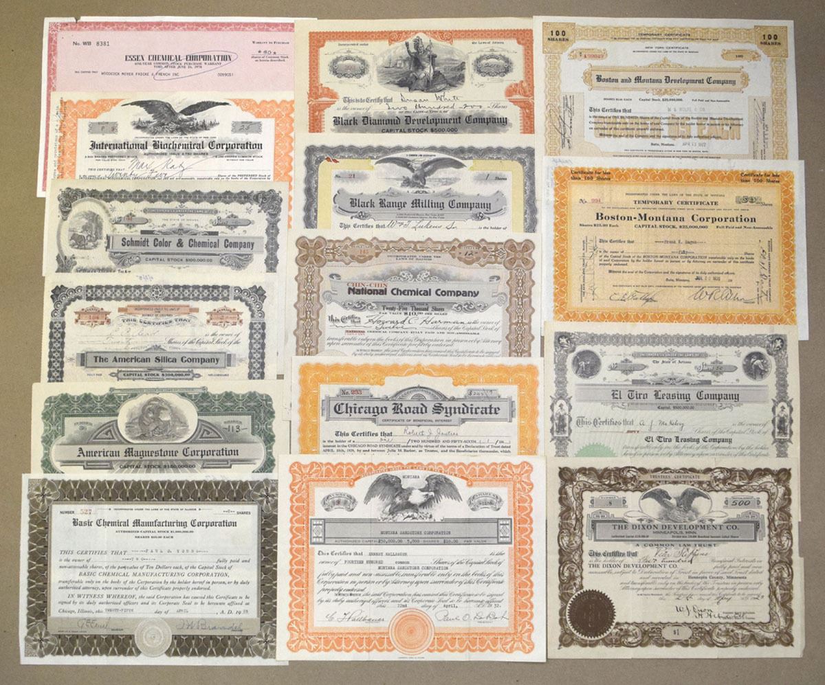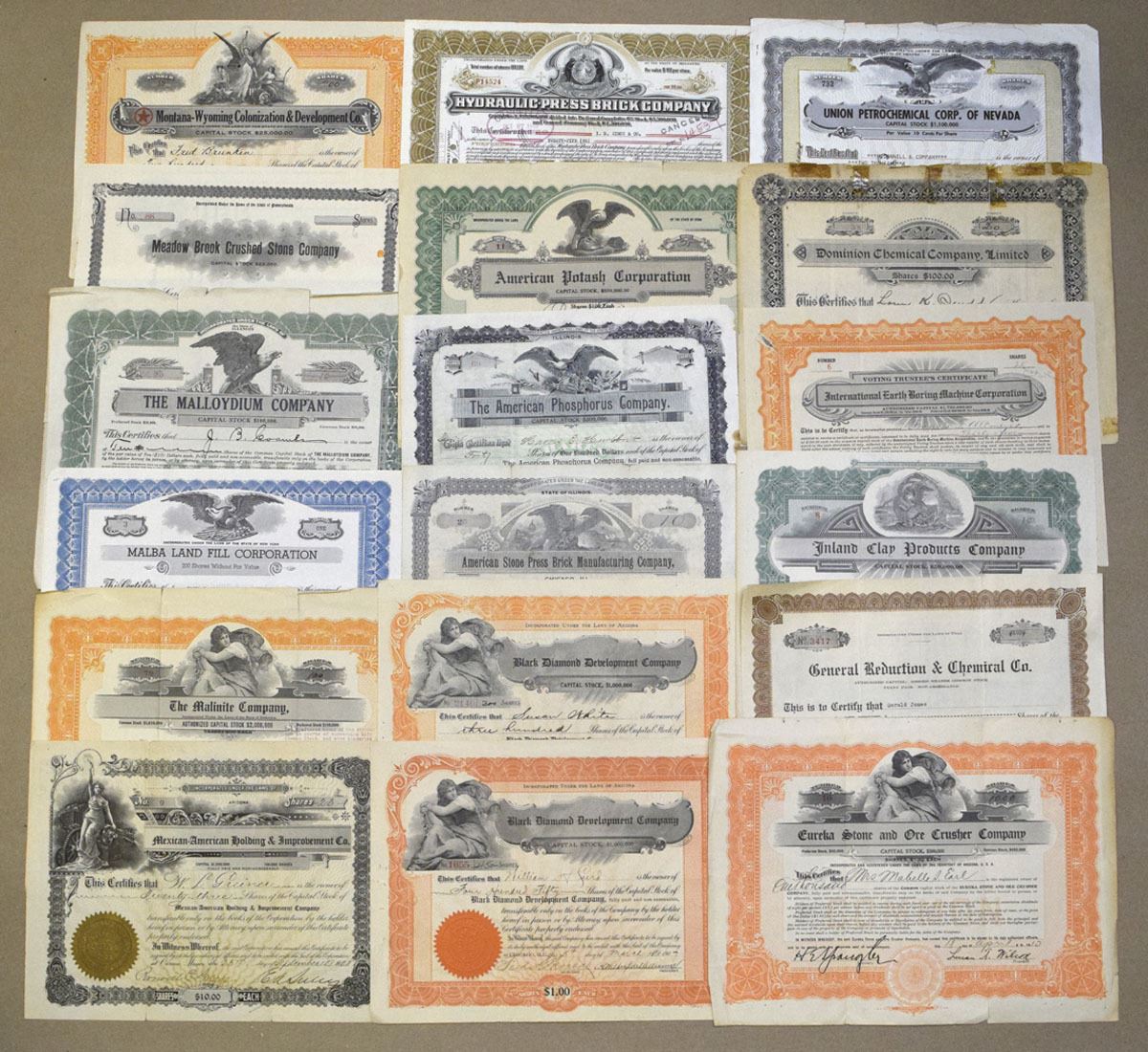 Various States, ca.1890-1960s. Lot of 35+ Issued Stocks and Bonds from U.S. and Canadian chemical, mining, and industrial companies, Highlights Includes: Montana-Wyoming Colonization & Development Co.; Hydraulic Press Brick Co.; Union Petrochemical Corp. of Nevada; Meadow Brook Crushed Stone Co.; American Potash Corporation; Dominion Chemical Co., Limited; The Mallyodium Co.; The American Phosphorus Co.; International Earth Boring Machine Corporation; Malba Land Fill Corporation; American Stone Press Brick Manufacturing Co.; Inland Clay Products Co.; Black Diamond Development Co. and more. Certificates include engraved vignettes of allegorical figures, industrial plants, and eagles, with both ornate late 19th century designs and mid-20th century corporate issues. A few are accompanied by Department of Financial Institutions correspondence. Conditions range from Fine to XF. (35+). Sold "AS IS" no returns accepted.