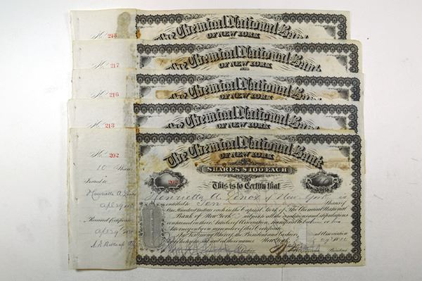 NY. $100 Shrs Stock Certificate. I/C. 5 pieces, with transfer documents, as pasted in to register book. Some paper tone evident. Fine. Possibly signed by notables.