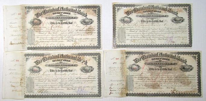New York, 1869-79. Lot of 4, I/C Capital Stock Certificates, All have black print on black border with title at top, S/Ns 80, 151, 187, 196, Certificates range from VG to Fine condition with toning and damage to margins, ABNC. (4). Sold "AS IS" no returns accepted. Issued to different Notable New Yorkers such as "Robert Lenox Kennedy", (November 24, 1822 Ð September 14, 1887), who was an American banker and philanthropist and served as president of the National Bank of Commerce in New York and the Lenox Library; and, Lawrence Hutton, who was born in New York City on August 8, 1843, and educated privately there. He was an inveterate traveler and for about 20 years spent his summers abroad. From about 1870 he contributed continually to periodicals. He was the dramatic critic of the New York Evening Mail from 1872 to 1874. From 1886 to 1898 he was the literary editor of Harper's Magazine. He was one of the organizers of the Authors' Club and of the International Copyright League, and was a member of the Players' Club, the Princeton Club, and the Nassau Club. An ardent collector of literary curiosities, his collections are of remarkable interest.