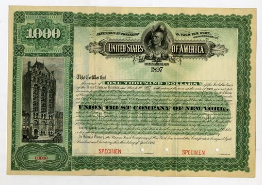 Cherokee Outlet, Oklahoma Territory, 1894 (Due March 4th, 1897), $1000 Specimen 4% Indebtedness of the United States of America, Certificate of Ownership, The Union Trust Company of New York was the trustee that administered this U.S. Federal bond, Vignette of Cherokee Indian on top title and bank building on left. Green border. Red specimen overprint, POC's and "00000" serial numbers. XF condition. Location of the "Cherokee Outlet" was a strip of land in Oklahoma territory. Specimen "Certificate of Ownership in 4% Indebtedness of United States of America, Due 1899". Back has legend "It is hereby certified that the United States of America have agreed to pay the "Cherokee Nation" the sum of Eight Million, Three Hundred Thousand Dollars ($8,300,00)in five equal annual installments, beginning.....at a rate of four per centum per annum, in consideration of the purchase by the U.S. of A. from the Cherokee Nation of certain lands known as the "Cherokee Outlet." The front of the bond has additional text "This indebtedness was incurred by the United States of America for the purchase from the Cherokee Nation of certain lands known as the Cherokee Outlet under an ACT OF CONGRESS APPROVED MARCH 3rd, 1893 and has been purchased from the Cherokee Nation and assigned as per copy of certificate of the Secretary of the Department of the Interior endorsed hereon to the UNION TRUST COMPANY OF NEW YORK, which holds it as trustee. Evidently, the Cherokee Nation did not want to wait for the annual settlement and took a discounted lump sum from R.T.Wilson & Company as factors. The amount of discount is not listed. Extremely rare and historic U.S. Federally bond.