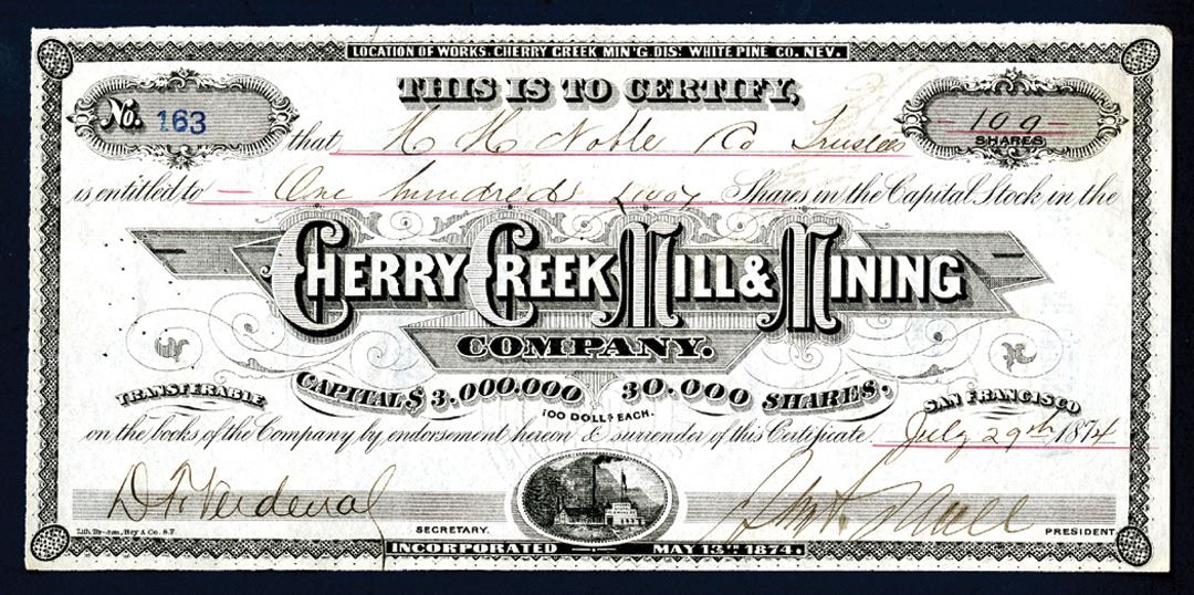 Cherry Creek Mining District, White Pine Co., Nevada, (Offices located in San Francisco). 1874, 100 Shares, I/U, Ornate certificate with small mill on bottom, XF condition, Attractive and from a new estate find.