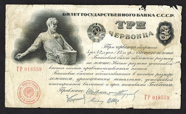 Russia - USSR. 3 Chervonetsa. P-197b. Sower at top left. Signature 2 group. Stain at top edge and slight paper loss and tear.