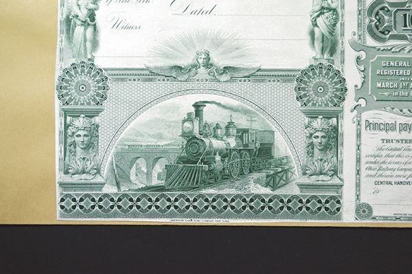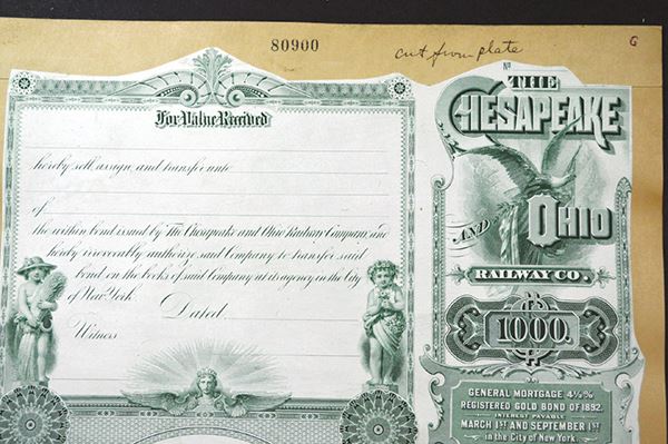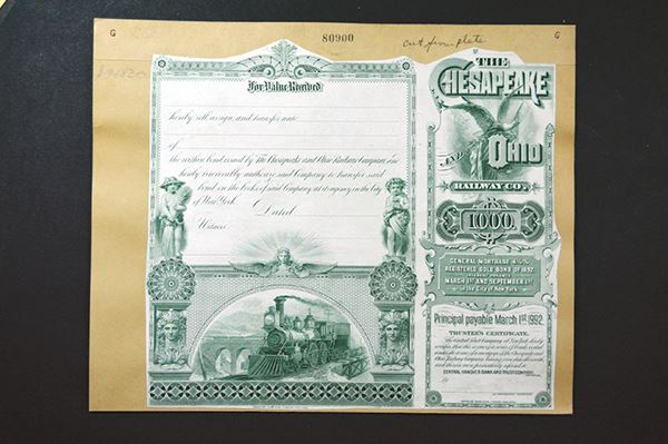 U.S.. ca.1880-1890's. Chesapeake & Ohio Ry. Co. 1892 Registered Bond back proof pasted to ABNC reference folder. As made.