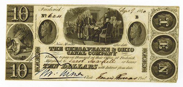 Frederick, Maryland. $10, issued Obsolete Banknote. "Signing of the Declaration of Independence" on top middle flanked by cameo medallions and reaper with sheaves at left, S/N 624, Issued and uncancelled. Choice AU to Uncirculated with crisp paper and bright impression, DU&Co.