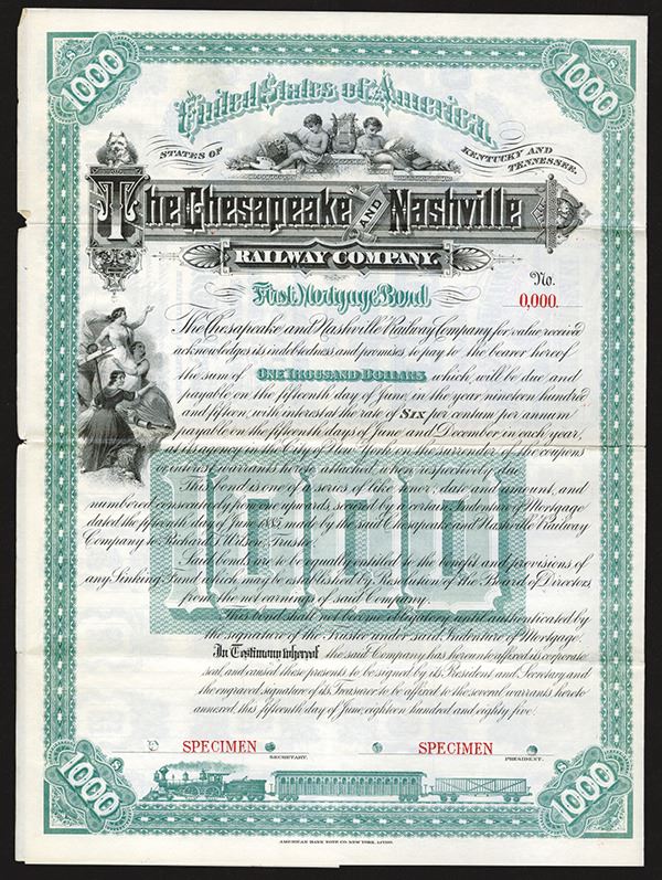 Kentucky and Tennessee. $1000, Specimen 6% First Mortgage Coupon Bond. Black ink with very ornate printing. Green border and under print. Vignette of two cherubs at top, with allegorical female figures at left hand side. Specimen overprints, POC's, VF, ABNC.