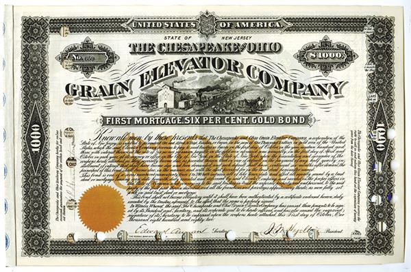 Chesapeake and Ohio Grain Elevator Co., 1882 Issued Bond Signed by C. P. Huntington.