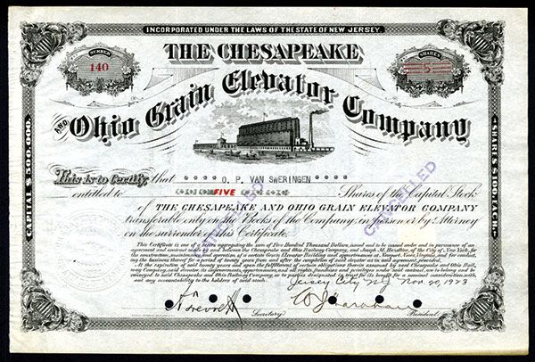 New Jersey. 5 Shares I/C Stock. #140. Black print with ornate black border and grain elevator vignette in center. POC's and purple CANCELLED stamps. VF condition. H.G. Riley Stationer. Stock is made out to O.P. Van Sweringen, early 20th century Ohio railroad baron who was close partners with his brother M.J. and signed by him on back.