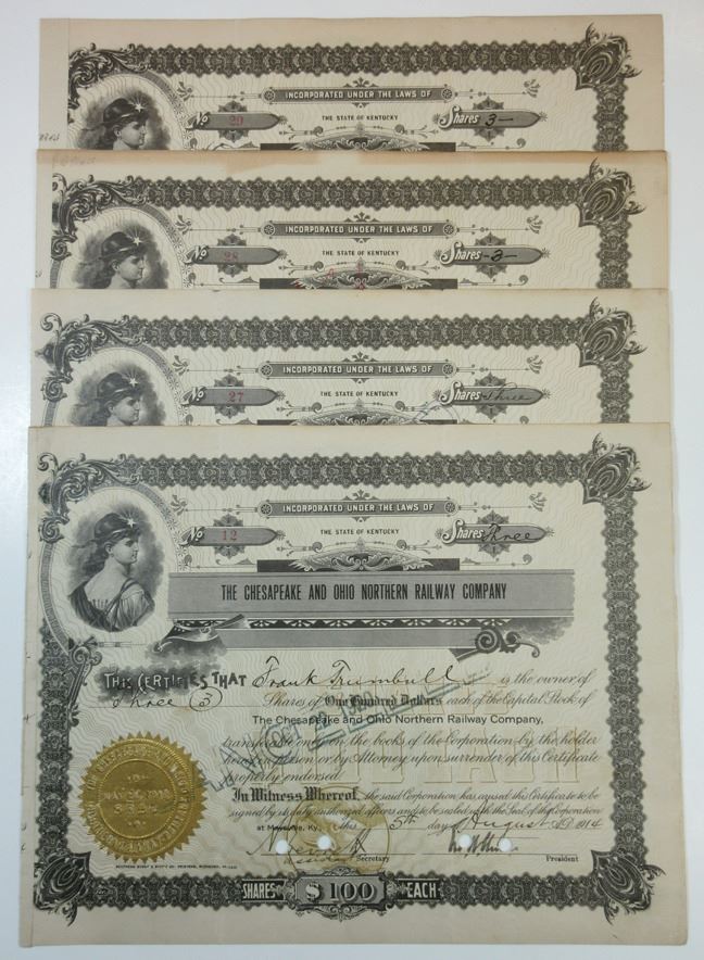Kentucky. Lot of 3 Stock Certificates for 3 Shares Each of Capital Stock, All have black print on black borders, Company title at top and an allegorical woman at top left corner, All are VG to Fine condition with minor toning/tears along margins. All are in consecutive order, S/N's 27,28, & 29. Scarce railroad, this is the only type and design available.