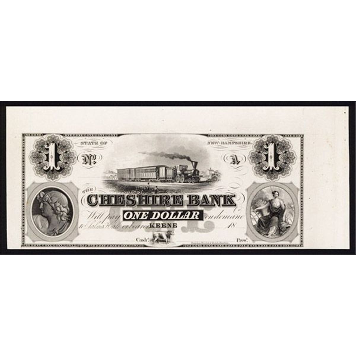 Keene, New Hampshire, 18xx (ca.1830's), $1, Plate A, NH-146-G4, Unlisted in census, Proof banknote, black on india paper on thin white card, Locomotive Plymouth passing men working by tracks in middle top, seated allegorical woman with plow, wheat and cornucopia on lower right and cameo profile on lower left, underprint ONE in middle, Choice to Gem Uncirculated condition with 3 jumbo margins on top and on the sides, the bottom large, Rawdon, Wright, Hatch & Co. Boston imprint. Known only as proof. (Silver City Collection, Part 2)