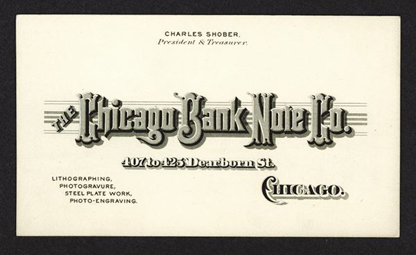 IL. 5 x 3 inches, Located at 407 to 425 Dearborn St., Chicago, Charles Shober, President and Treasurer listed on top, Rare security printer business card.