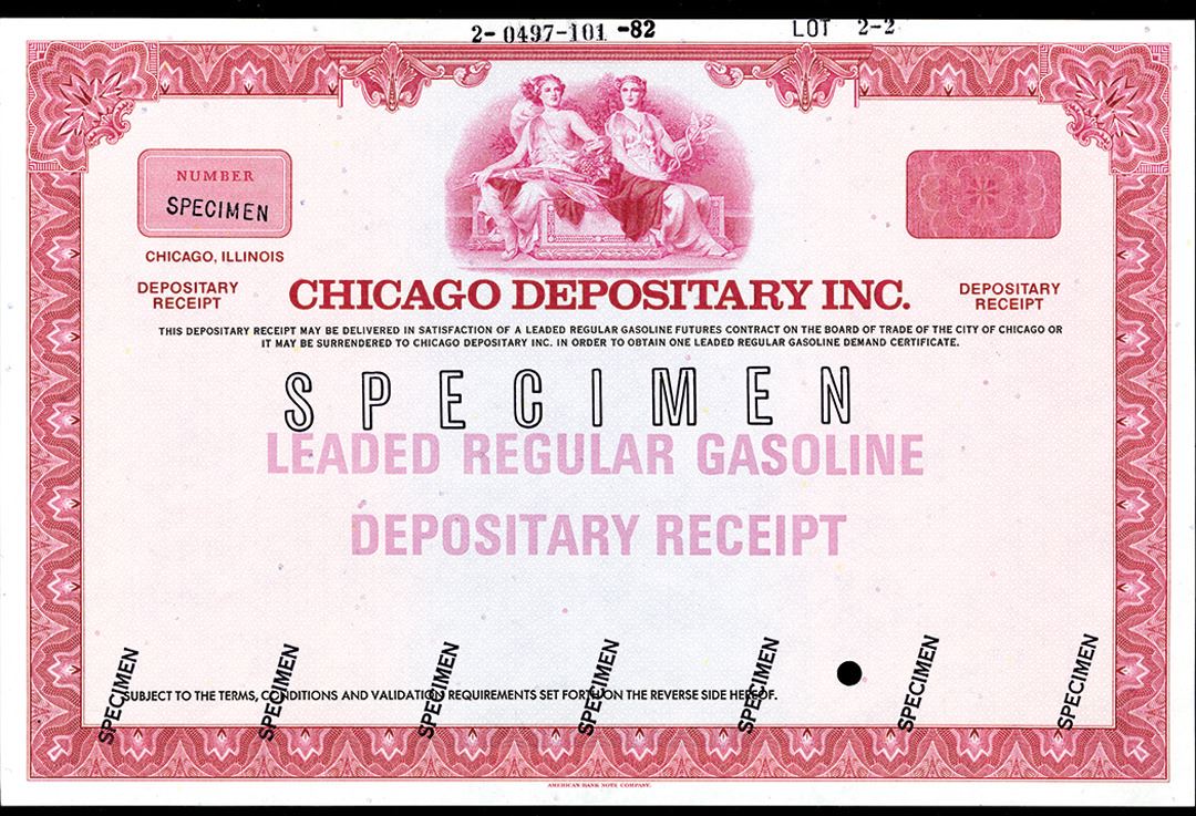 Chicago, Illinois, 1982, Black on pink border and underprint, Vignette of two allegorical women sitting, POC's, VF-XF condition, ABNC. Leaded Regular Gasoline Depository Receipt on the Chicago Board of Trade for Futures trading. Rare.