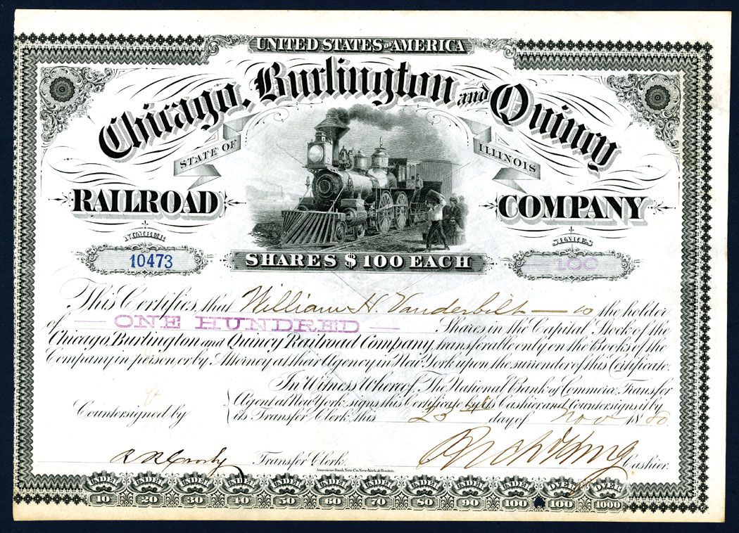 Illinois, 100 Shares, Issued and cut cancelled, ITASB William H. Vanderbilt, Locomotive with steamboat behind, VF-XF condition, ABNC. William was the son of Cornelius "The Commodore" Vanderbilt.