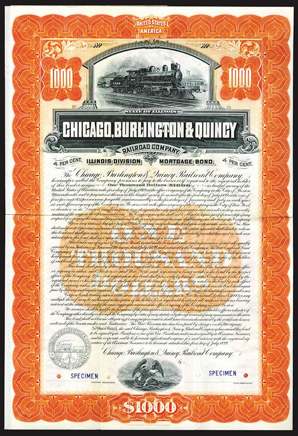 Illinois, 1898, $1000 4% Illinois Division Mortgage, Specimen Gold Coupon Bond, Black with orange border and underprint, Locomotive "C.B.&O.", VF+, ABNC. ABNC. Attractive.