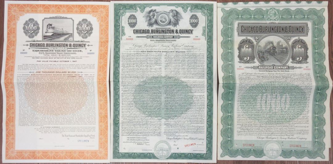 Illinois. Lot includes 3 bonds: $1000 Specimen 2.5% Equipment Trust Certificate in orange; $1000 Specimen 3.5% Collateral Trust Bond in green; $1000 Specimen 4% General Mortgage Bond in green. All have specimen overprints, 00000 serial numbers, and POCs. (3)