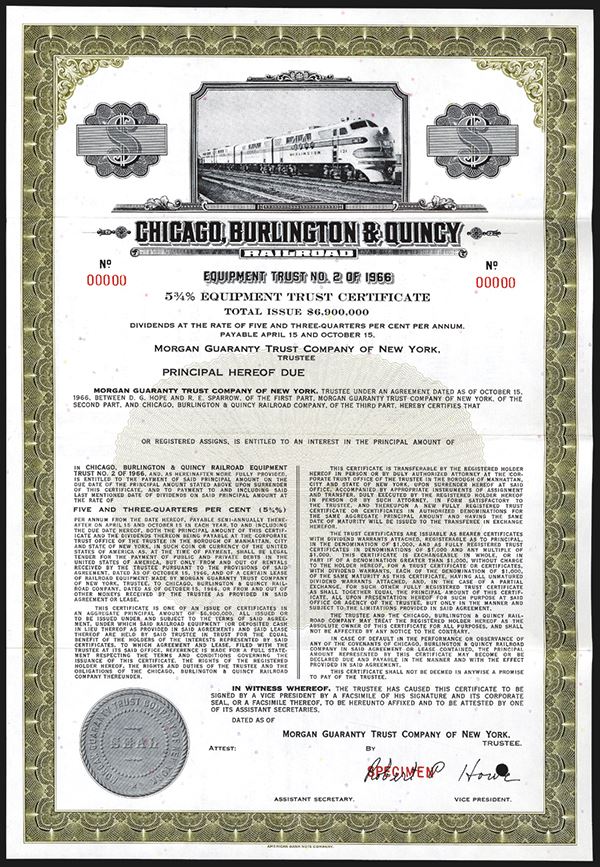 Illinois. $-Odd, Specimen Registered 5 3/4% Equipment Trust No.2 of 1966, Black on olive green border and underprint, Photograph of a Diesel Locomotive L-R, ABNC. Rare and very attractive.
