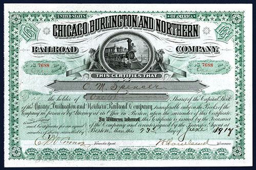Massachusetts, 1917, I/U, #7688, 1 Share, Black print on green border and underprint, Moving locomotive top center, VF condition, ABNC.