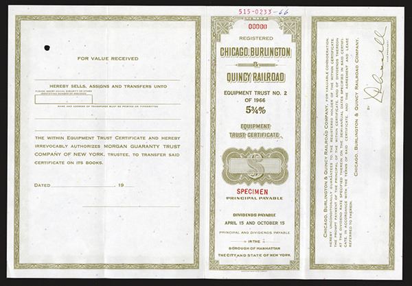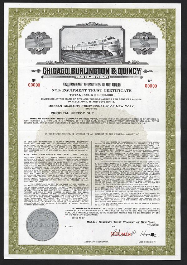 Illinois. Specimen 5 3/4% Equipment Trust Certificate. Blank ink with Olive border and under print. Modern train vignette at center. Specimen overprints, POC's, VF, ABNC.