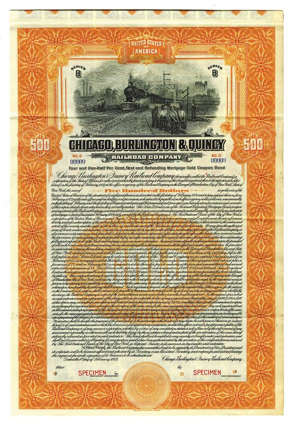 Illinois. $500 Specimen 4 1/2% Series B, 1st and Refunding Mortgage Gold Coupon Bond, Black print on orange border and under tint, Image of locomotive coming around corner with men carrying a railroad tie, Specimen overprints, POC's, VF-XF condition. ABNC. Listed Railroad in Cox, but Unlisted Bond Type.