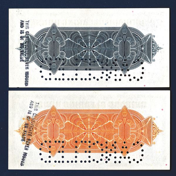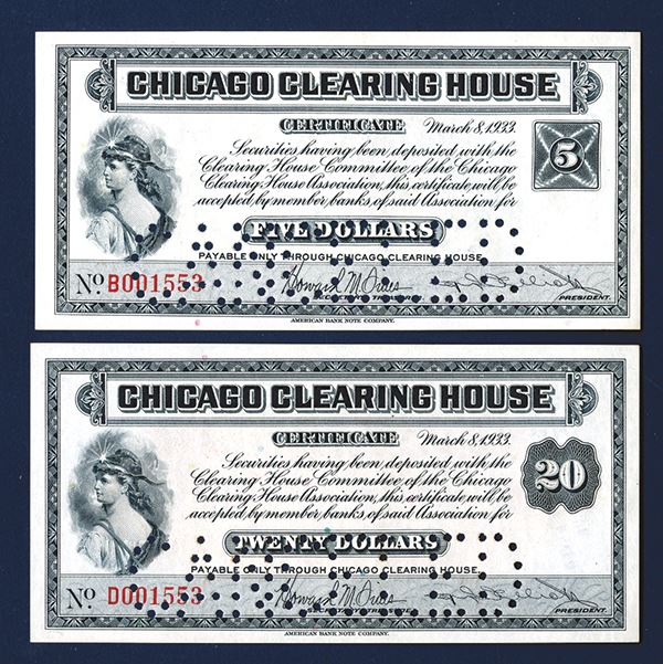 Chicago, Illinois. Clearing House Certificate, March 1933. $5, and $20. ABNC. Both have rubber stamp on back: THIS CERTIFICATE NEVER ISSUES AND IS OF NO VALUE. Perforated CANCELLED. Otherwise Uncirculated and choice. 2 pieces.
