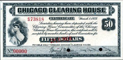 Chicago, IL. 1933. $5; $10; $20; $50 4 different specimen banknotes, all are black. 3 have allegorical woman "Liberty" on left with star in hat and were printed by ABNC while the fourth has Fort on left and was printed by Columbian BNC. All have red specimen overprints, POC's and "00000" serial numbers. The $5 back is black, the $10 back is green, the $20 back is orange and the $50 back is red. Choice Unc. ABNC.